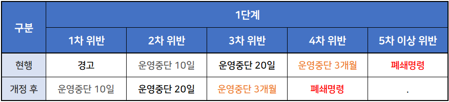 - 방역지침을 1차로 위반하는 경우 현행 경고 처분에서, 개정안에 따라 운영 중단 10일의 처분이 가능해짐