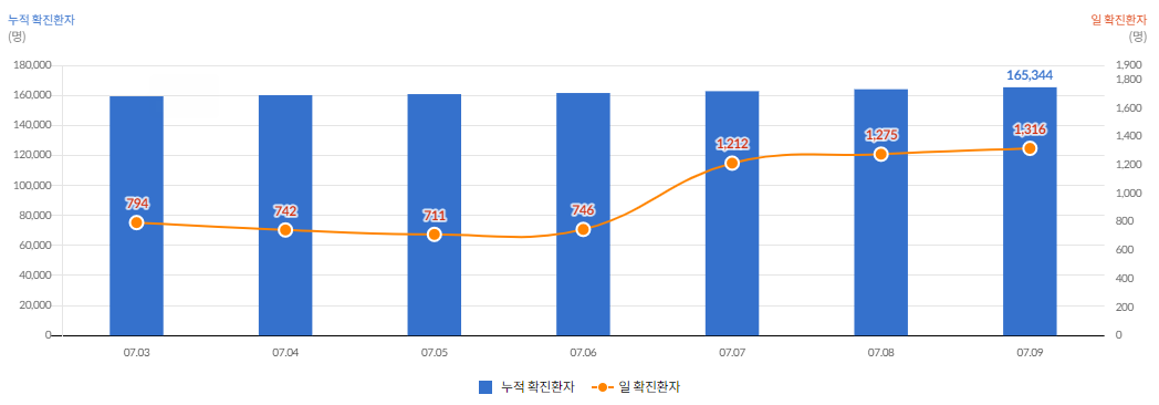 일일 확진자는 1,316명(7.9 00시 기준), 누적 확진자는 165,344명,