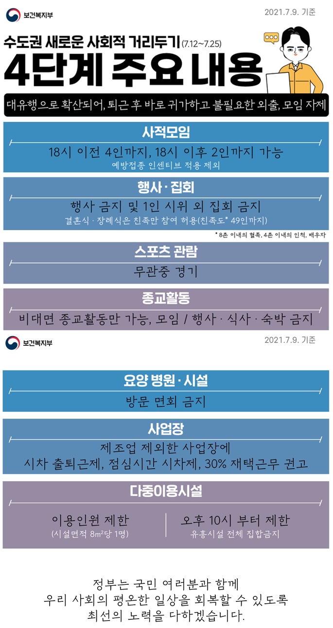 1) 수도권의 새로운 거리두기 4단계 지역은 7월 12일(월) 0시부터 7월 25일(일) 24시까지 4단계 조치 외 추가로 방역수칙을 적용한다.