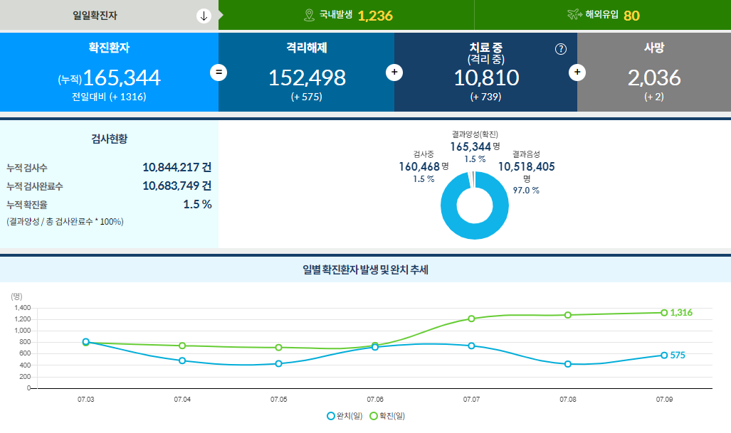 일일 확진자는 1,316명(7.9 00시 기준), 누적 확진자는 165,344명,
