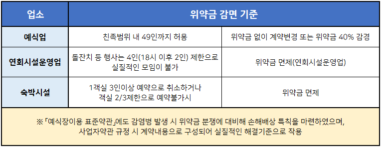 - 공정거래위원회는 수도권 4단계 시행에 따라 위약금 분쟁이 빈발할 것으로 예상되는 예식업·연회시설 운영업·숙박업 등에 대한 위약금 분쟁을 해소하기 위해 노력할 계획이며, 감염병 발생 시 위약금 감면기준과 표준약관이 현장에서 제대로 작동할 수 있도록 관계 기관(지자체·소비자단체·사업자단체 등)에 협조를 요청하였다.