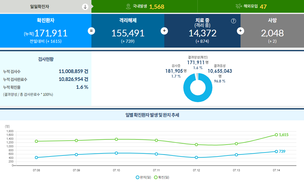 일일 확진자는 1,615명(7.14 00시 기준), 누적 확진자는 171,911명,