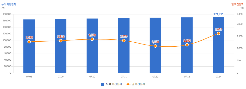 일일 확진자는 1,615명(7.14 00시 기준), 누적 확진자는 171,911명,