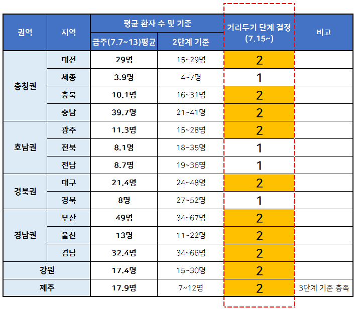 1) 비수도권은 7월 15일(목)부터 거리두기 기준 및 지역 상황을 고려하여 지자체별로 단계를 조정한다.