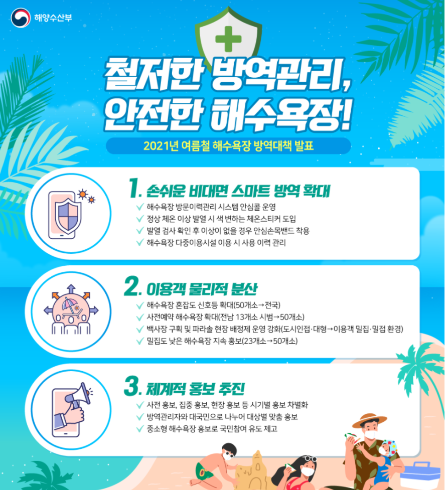 - 해양수산부는 해수욕장 방역대책의 이용객 참여를 유도하기 위해 7~8월 기간에 방역수칙 준수를 위한 주말 캠페인을 진행하고, 고속도로 휴게소, 기차역 등에 홍보물을 적극 배포하여 해수욕장 방역대책을 지속 홍보할 예정