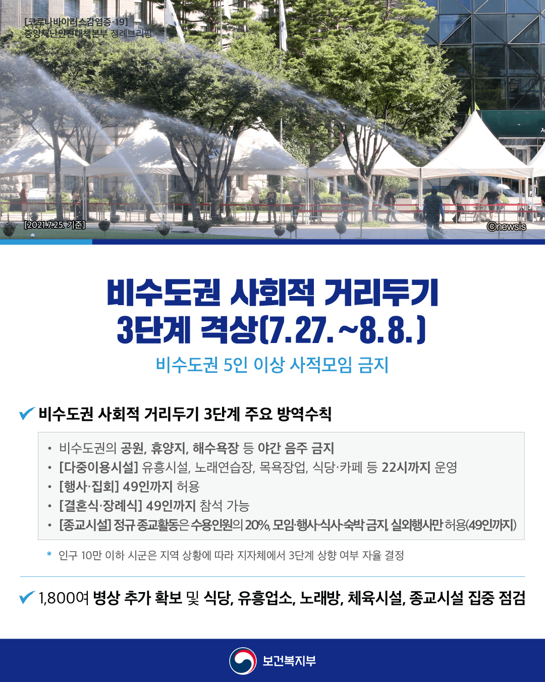 1) 비수도권 전체에 대해 7월 27일(화) 0시부터 8월 8일(일) 24시까지 사회적 거리두기 3단계로 격상한다.