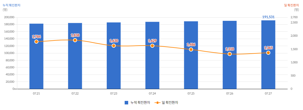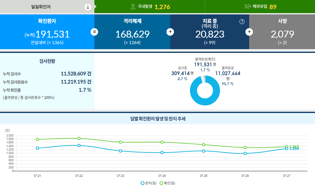 일일 확진자는 1,365명(7.27 00시 기준), 누적 확진자는 191,531명,