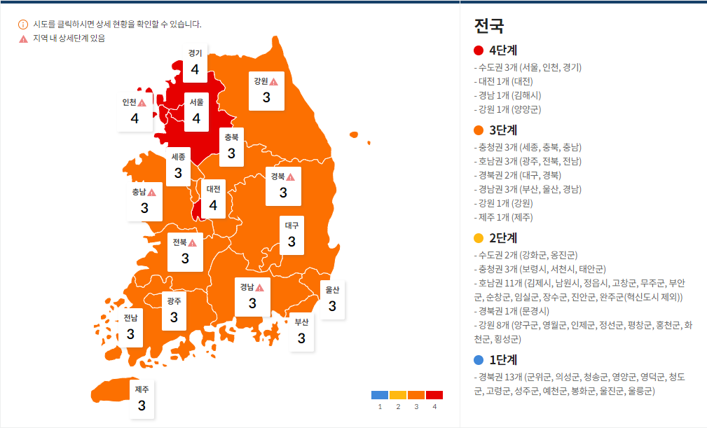 반대로 전국이 3~4단계로 거리두기가 격상이 되었네요..