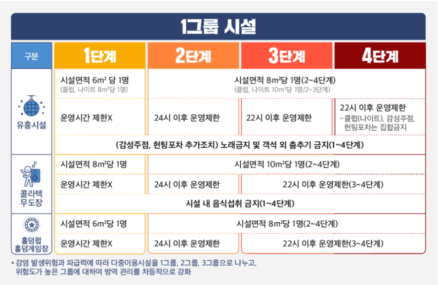 - 유흥시설 집합금지, 실내체육시설 등 22시 운영 제한은 거리두기 4단계 수칙으로 3단계에서 의무는 아니지만, 필요시 지자체가 행정명령으로 실행 가능함
