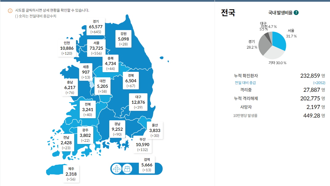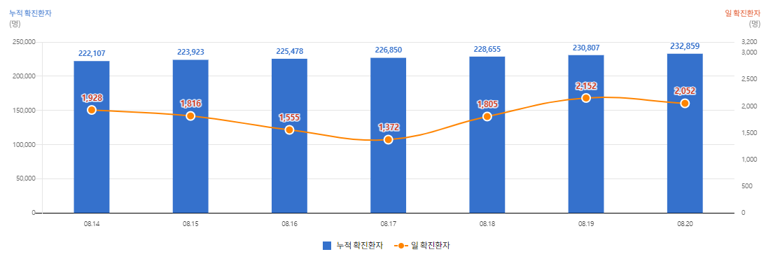 일일 확진자는 2,052명(8.20 00시 기준), 누적 확진자는 232,859명,