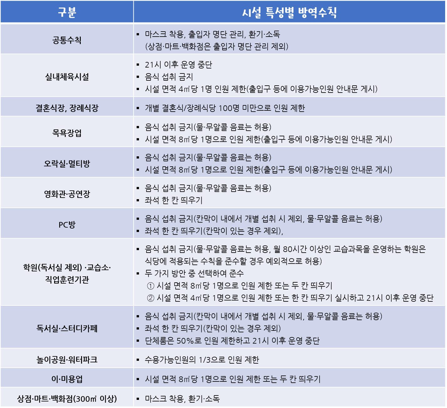 [사회적 거리 두기 단계별 기준 및 방역 조치]