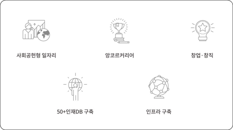 - 50+세대의 역량을 활용하여 사회적으로 공헌할 수 있는 공헌형·혼합형 중심의 일자리를 발굴하고 확산합니다.