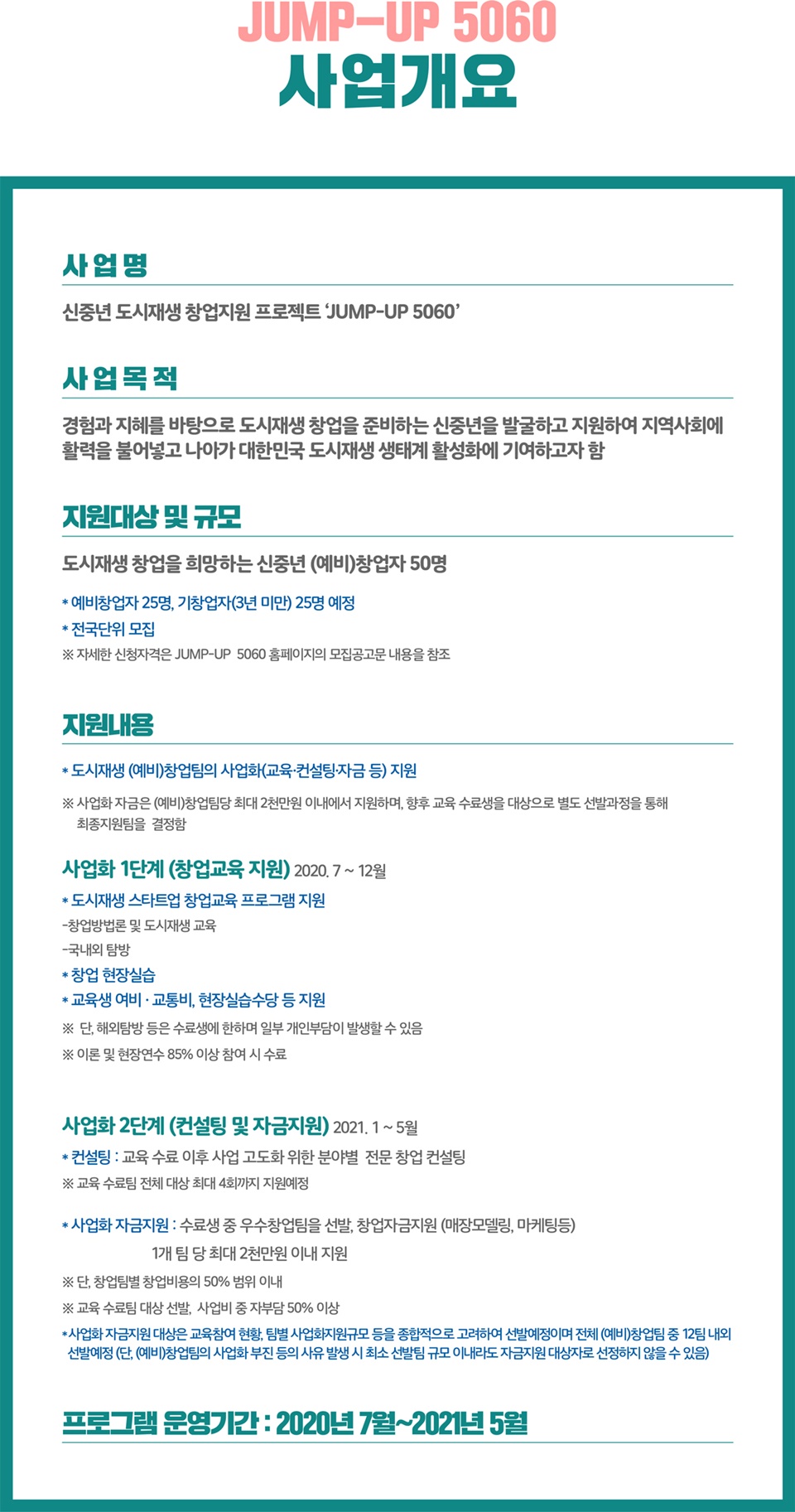 신중년 도시재생 창업지원 프로젝트 JUMP-UP 5060은 한국토지주택공사와 서울시 50 플러스재단이 협력하여 진행하는 사업으로 기존 과열 업종을 벗어나 도시를 되살릴 창업 아이템을 가진 신중년 창업가를 발굴하고 선정하여 실제 창업에 도움이 되는 교육 및 실습 과정을 통해 사업화에 이르기까지 지원하고 있습니다.